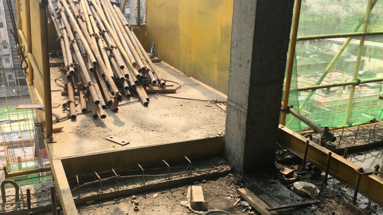 32 如图所示,卸料平台存在安全隐患,正确的处置方法是?()