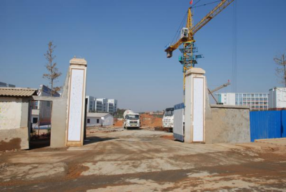 56 如图所示施工大门,根据建筑施工安全检查标准JGJ59-2011文明施工检查评分表要求,施工现场出入口大门应设置哪些标识标牌和设施()?