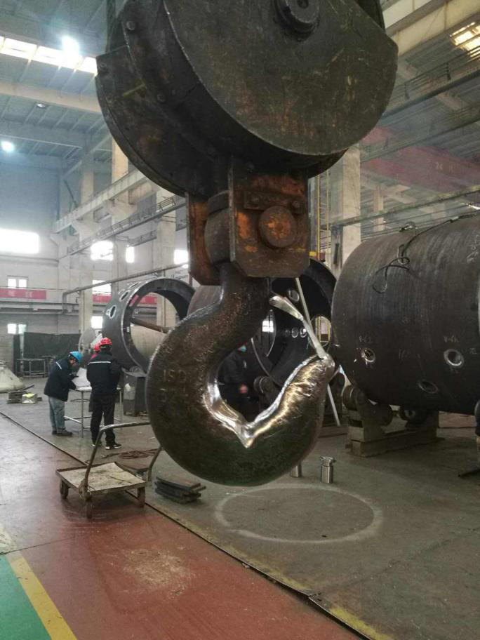 8 下图为某钢结构加工厂使用的天车吊钩,判断该吊钩继续使用是否存在安全隐患,正确的整改措施是()。