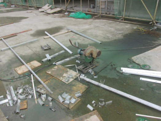 1 如下图所示,切割环境存在安全隐患,改进措施为()。