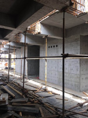 61 悬挑式钢平台的搁支点与上部拉结点,宜设置在脚手架等施工设施上。()