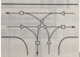 18 在下列冲突点、分流点、交织点的图示中,“△”。表示()。