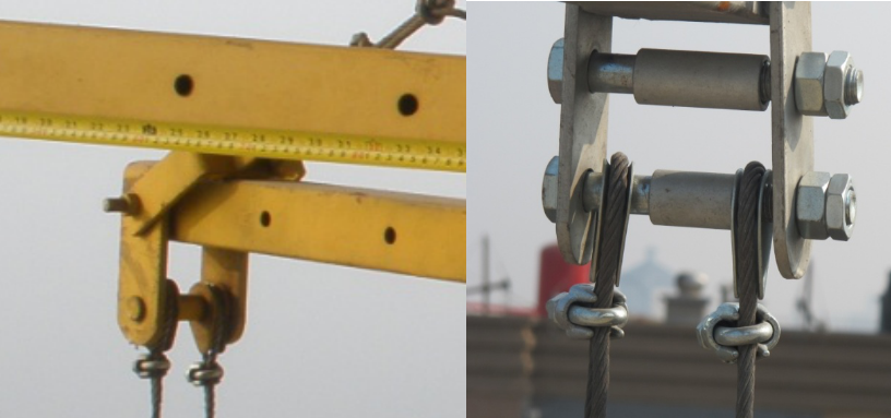 12 下图为某建筑施工现场高处作业吊篮悬挂机构与吊篮钢丝绳设置情况,判断图片中存在的安全隐患并给出正确的整改措施。()