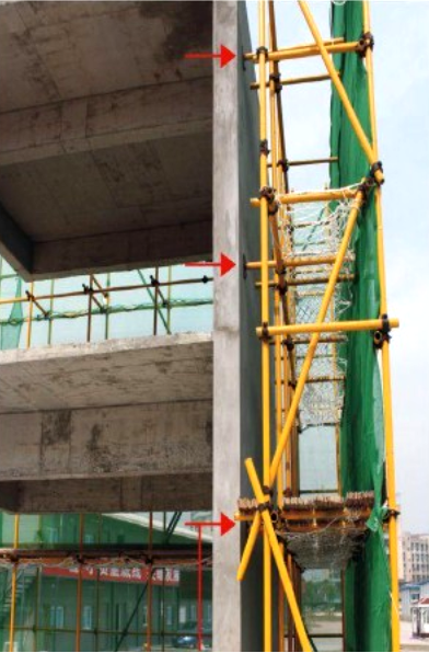 38 绑扎3m以上的柱钢筋,必须搭设操作平台,已绑扎好的钢筋骨架,应用临时支撑拉牢,以防倾斜。