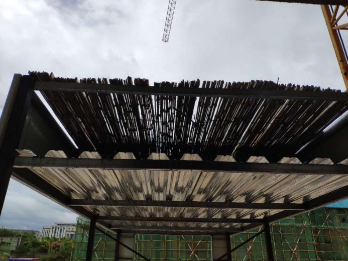 3 下图为某在建工程人员进出的安全通道,防护棚顶部用竹串片脚手板铺设,未固定。下列说法不符合要求的是:()