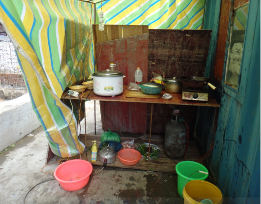 D. 民工使用雨布、模板搭设临时厨房